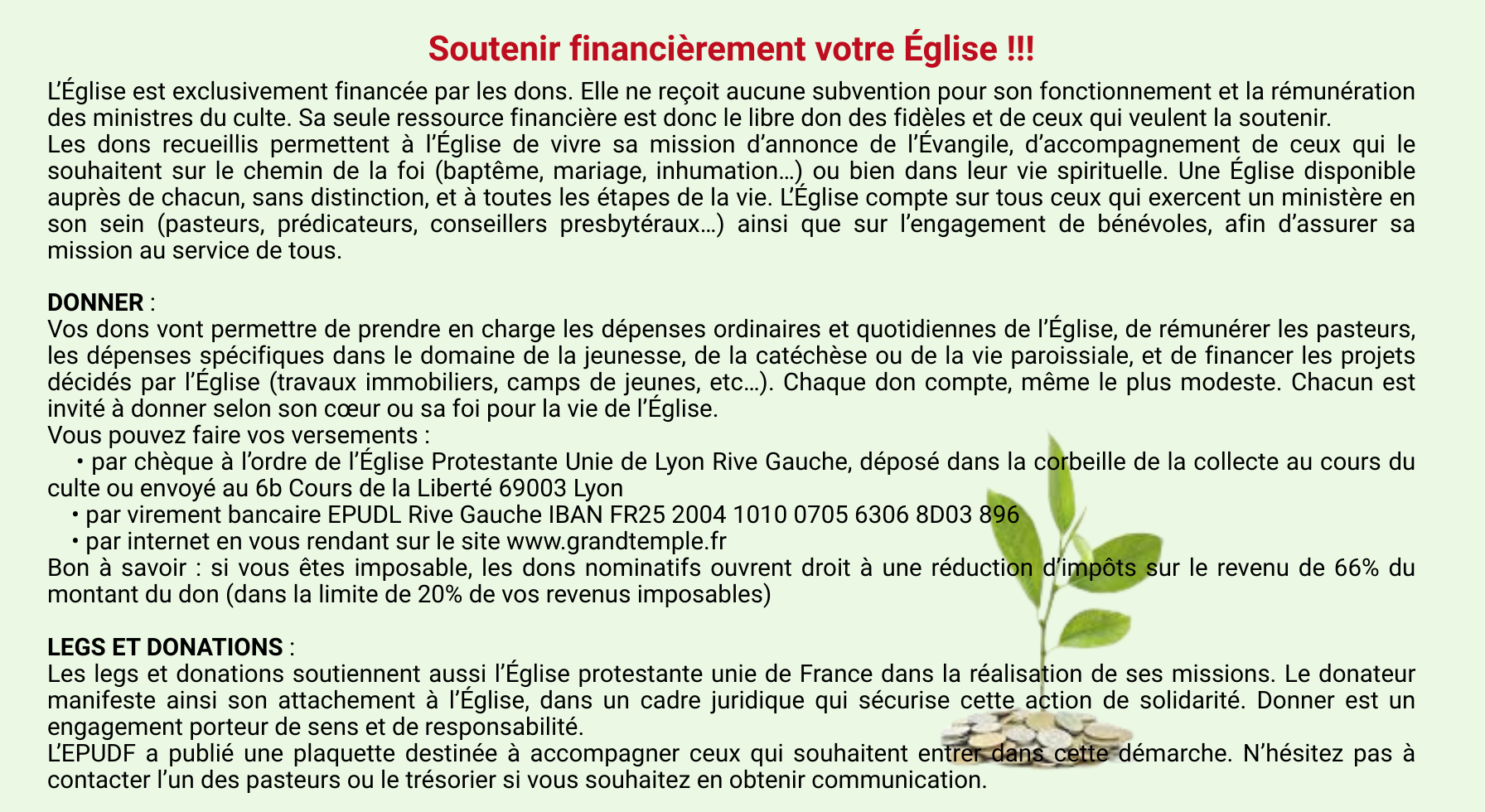 - par chèque à l’ordre de l’Église protestante unie de Lyon rive gauche, déposé dans la corbeille lors de la collecte, ou envoyé au secrétariat : 6b cours de la Liberté, Lyon 3e